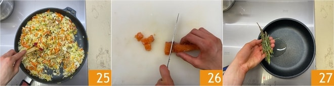 Mantenha aquecido 25 e cuide do salmão: corte o peixe em cubos 26, em uma frigideira adicione um fio de óleo e um maço de tomilho e alecrim 27.
