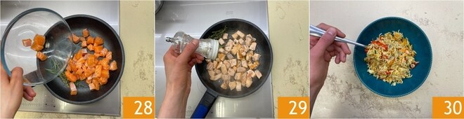 Adicione os cubos de peixe e salteie por cerca de 5 minutos 28, depois adicione sal 29. Em um prato de servir, adicione o arroz 30.