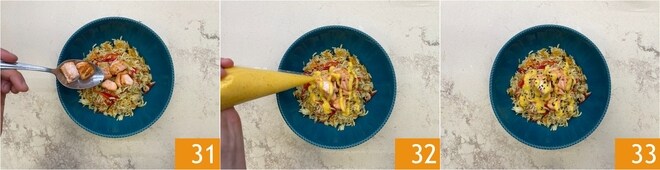 Adicione os cubos de salmão salteados 31, tempere com a maionese caseira e finalize com as sementes de gergelim preto 33. Seu arroz basmati com salmão, gergelim e molho picante está pronto para ser servido!