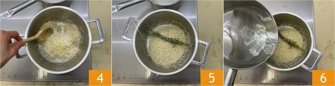 Toque o arroz mexendo com frequência 4 e, quando estiver bem quente, adicione tomilho e alecrim amarrados com um barbante 5. Despeje a água fervente 6, cubra com a tampa e abaixe o fogo. Cozinhe o arroz seguindo o tempo indicado na embalagem, cerca de 10 minutos.