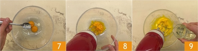 Enquanto isso, prepare a maionese: em uma tigela, junte as gemas em temperatura ambiente e o suco de limão 7. Comece a bater as gemas com um batedor elétrico 8 e, quando ganharem consistência, adicione o óleo de girassol em fio 9 e incorpore aos poucos até que seja totalmente absorvido.