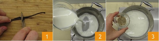 Para preparar o arroz doce com açafrão, comece pela infusão. Corte a fava de baunilha e raspe as sementes 1. Em seguida, vá para o fogão e despeje em uma panela o leite de amêndoas 2. Depois, adicione as sementes de erva-doce 3,
