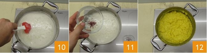 e cozinhe por 25 minutos mexendo de vez em quando em fogo médio 10, a mistura nunca deve ferver, caso contrário o líquido secará muito rápido. Após o tempo indicado, adicione os pistilos de açafrão 11, guardando alguns para a decoração, e continue mexendo de vez em quando, deixando cozinhar por mais 25 minutos. No total, o arroz doce cozinhará por cerca de 50 minutos: no final do cozimento, deverá estar macio e cremoso, mais ou menos como um pudim 12.