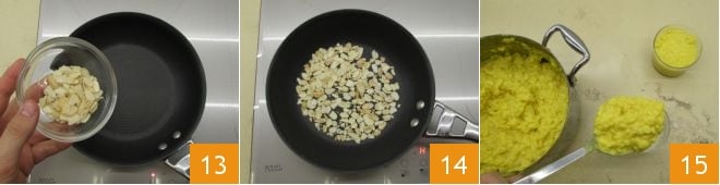 Enquanto isso, despeje em uma panela as lâminas de amêndoas 13 e torre-as em fogo alto 14, mexendo frequentemente para evitar que queimem. Divida a mistura em 6 copos com capacidade de 150 ml 15.