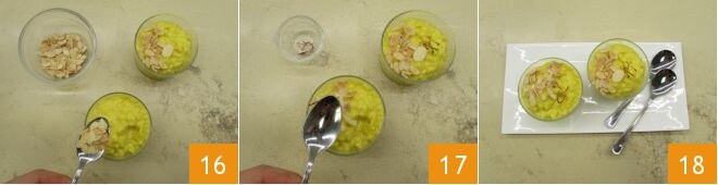 Em seguida, decore os copos com as lâminas torradas 16 e alguns pistilos 17. Aqui estão prontos seus copinhos de arroz doce com açafrão, agora é só saboreá-los 18!