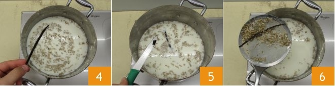 a vagem 4 e suas sementes 5 e deixe aquecer para saborizar tudo por 10 minutos em fogo baixo, sem nunca atingir a fervura. Neste ponto, coe o líquido usando uma peneira fina 6, dessa forma você poderá descartar a erva-doce e a fava de baunilha.