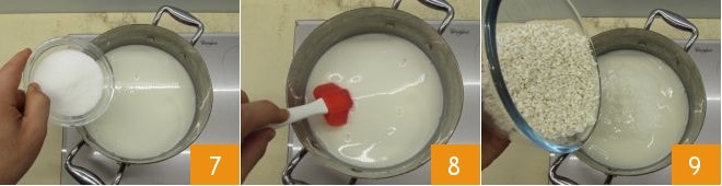Despeje o açúcar no leite 7, aumente a temperatura até quase ferver enquanto mexe com uma espátula para dissolver o açúcar 8. Adicione o arroz 9