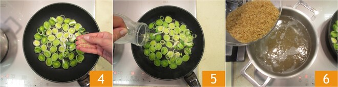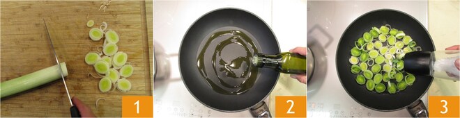 Para preparar o arroz integral morno, fatie finamente, cerca de 5 mm, o alho-poró eliminando a extremidade com as raízes 1. Despeje um fio de óleo em uma frigideira, adicione o alho-poró cuidando para não sobrepor as fatias. Salgue 3 e apimente.