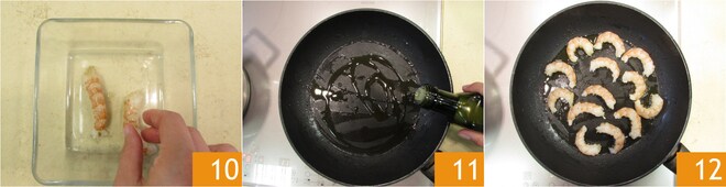 Elimine a carapaça 10. Na mesma frigideira em que você cozinhou o alho-poró, despeje um fio de óleo 11 e adicione os camarões previamente descascados 12.