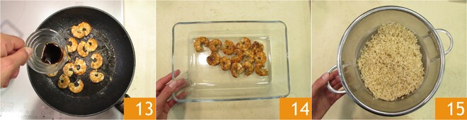 Cozinhe em fogo alto 1 minuto de cada lado. Adicione o molho de soja 13 e cozinhe por alguns minutos. Transfira os camarões para uma travessa 14 e reserve. Escorra o arroz cozido 15.