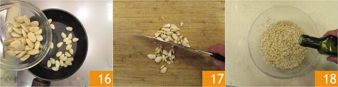 Salteie as amêndoas inteiras na frigideira 16 até dourar e depois pique grosseiramente 17. Transfira o arroz morno para uma tigela grande, tempere com óleo 18.