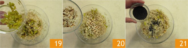 Adicione também o alho-poró 19, as amêndoas picadas 20 e o gergelim preto 21.