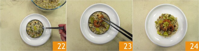 Misture tudo. Emprate usando um anel de 10 cm e pressionando levemente o arroz dentro 22. Finalize o prato com os camarões salteados ao molho de soja 23 e um fio de óleo cru 24.