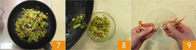Uma vez cozido 7, transfira o alho-poró para uma tigela 8 e reserve. Retire a cabeça dos camarões 9.