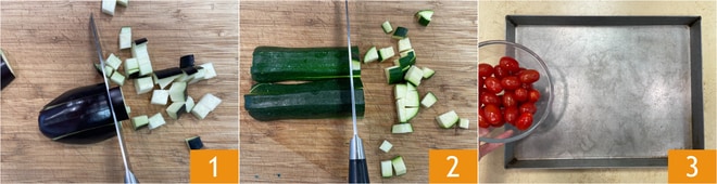 Para preparar o arroz morno com grão-de-bico, legumes assados e feta, comece lavando os legumes, depois corte as berinjelas e corte-as em cubos de aproximadamente 1,5 cm 1. Faça o mesmo com as abobrinhas 2. Em uma assadeira, coloque os tomates-cereja 3.