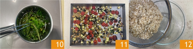 Deixe por 10 minutos em fogo bem baixo. Retire as ervas 10 e deixe esfriar. Retire os legumes do forno 11. Escorra o arroz e transfira-o para uma tigela 12.
