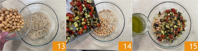 Adicione o grão-de-bico escorrido ao arroz 13, incorpore também os legumes 14 e tempere com o óleo aromatizado 15.