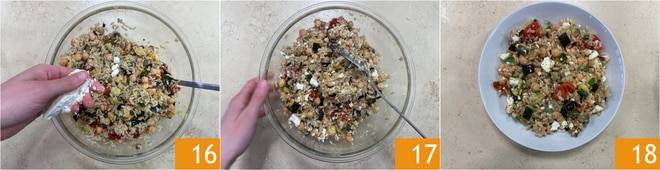 Esmigalhe a feta 16 e misture para dar sabor 17, ajuste o sal e a pimenta, adicione algumas folhas de orégano fresco. Seu arroz morno com grão-de-bico, legumes assados e feta está pronto para ser servido 18.