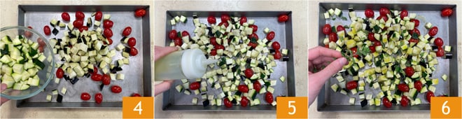Adicione também as berinjelas e as abobrinhas 4, tempere com óleo 5, sal, pimenta e orégano fresco 6, asse em forno estático a 230°C por 20 minutos.