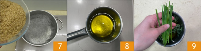 Enquanto isso, cozinhe o arroz integral em água salgada pelo tempo indicado na embalagem 7. Enquanto isso, prepare o óleo aromatizado colocando o óleo em uma panelinha 8 com as ervas frescas que você tiver em casa 9 (alecrim, cebolinha, funcho, orégano, manjerona, manjericão, salsinha ou tomilho).