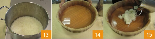 Retome o arroz 13 e pegue o hangiri, um recipiente baixo e largo de madeira que serve para temperar o arroz. Molhe-o com água e escorra-o 14, assim a madeira não absorverá o vinagre. Coloque o arroz dentro 15