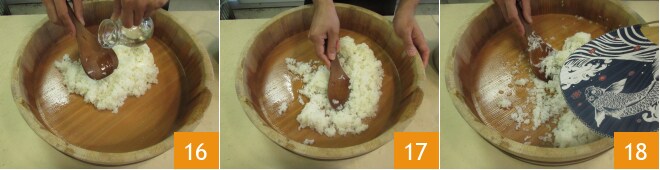 e adicione a mistura de vinagre filtrado, deixando-a escorrer na colher para espalhar sobre o arroz 16. Mexa o arroz movendo-o de lado para não esmagá-lo 17. É importante mexer até que apareça brilhante e bem temperado. Para resfriá-lo, faça vento com um leque 18 para que o vinagre evapore rapidamente.