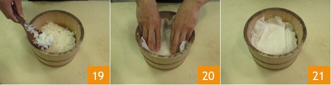Uma vez temperado, transfira o arroz para o ohitsu 19, o recipiente de madeira que permitirá manter a temperatura do arroz, e cubra-o com um pano de papel úmido para manter o calor constante 20. Alternativamente, você pode usar um recipiente de madeira ou de aço coberto com um pano úmido. Quando o arroz estiver morno, você poderá usá-lo e servi-lo para o seu sushi 21.