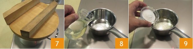 Cozinhe em fogo médio por 5 minutos, depois abaixe a chama e cozinhe por mais 7 minutos em fogo baixo. Neste ponto, retire a panela do fogo 7 e deixe repousar por mais 6 minutos, sem tirar a tampa. Depois, coloque a panela de volta no fogo em chama média por outros 30 segundos. A consistência deve ficar ligeiramente al dente. Agora prepare a mistura de vinagre de arroz, que dará um gosto ligeiramente ácido ao arroz. Em uma panela pequena, coloque o vinagre de arroz 8 e adicione o sal 9.