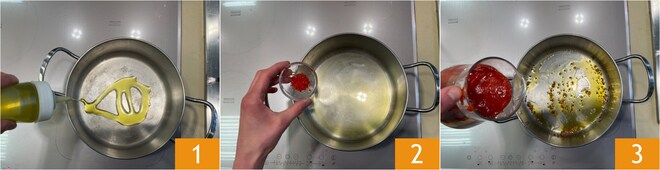 Para preparar o arroz picante com ovo frito, comece pelo molho: em uma panela, despeje um fio de azeite 1 e a pimenta malagueta picada 2 e refogue em fogo médio por cerca de 5 minutos, adicione o molho de tomate 3, cozinhe por 30 minutos.