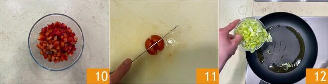 Depois corte em cubos de 1,5 cm 10. Corte os tomatinhos em quartos 11. Aqueça uma frigideira, quando estiver quente, adicione o azeite e o alho-poró 12.