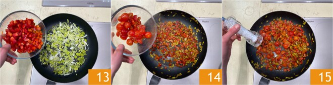 Adicione os pimentões 13 e cozinhe em fogo médio por 10 minutos. Em seguida, adicione os tomates 14 e salteie por mais 5 minutos. Salgue e mantenha quente 15.