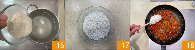 Cozinhe o arroz em bastante água salgada, deixando-o ligeiramente cru, de acordo com o tempo indicado na embalagem 16. Escorra o arroz 17 e coloque-o na frigideira onde os legumes foram cozidos 18.