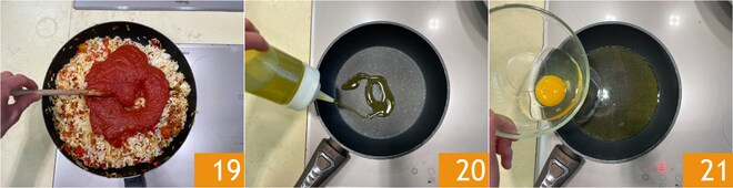 Adicione o molho de tomate 19. Salteie tudo junto em fogo alto para secar um pouco o arroz e obter uma casquinha. Enquanto isso, aqueça em uma frigideira o azeite de oliva extra virgem 20, deve cobrir todo o fundo. Quebre um ovo em uma tigela e despeje na frigideira 21.
