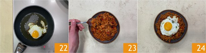 Cozinhe por 3 minutos 22 e salgue. Transfira o arroz para o prato 23, complete com o ovo frito e a manjerona fresca 24.