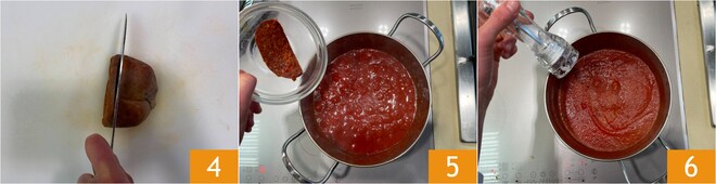 Corte a nduja em fatias 4 e coloque-a no molho ao final do cozimento 5, mexa para que ela derreta. Salgue e mantenha quente 6.
