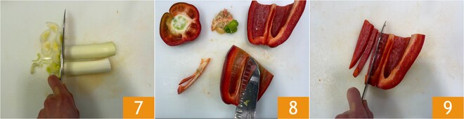 Lave e corte o alho-poró em fatias finas 7. Limpe os pimentões 8 e corte-os primeiro em tiras 9.