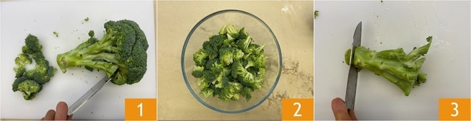 Para preparar o arroz salteado com coco, limpe os brócolis, remova as folhas externas, separe os floretes 1 e reserve-os 2. Corte a extremidade do talo 3 e remova a parte externa mais resistente.