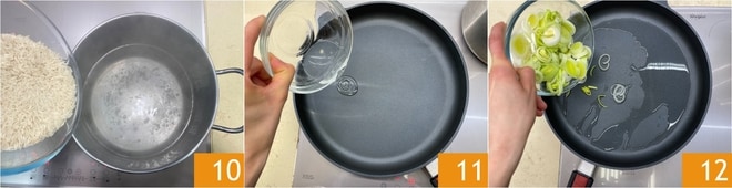 Agora, leve uma panela cheia de água salgada para ferver e cozinhe o arroz al dente 10. Em uma frigideira, coloque o óleo de coco 11, quando estiver quente, adicione os alhos-porós 12 e cozinhe por 3 minutos.