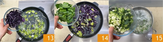 Adicione o repolho 13 e salteie tudo em fogo médio por 5 minutos, depois adicione as folhas de acelga 14. Após os primeiros 5 minutos de cozimento do arroz, adicione à panela também os brócolis (floretes e talos) 15.