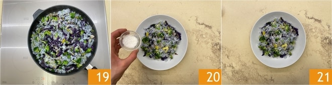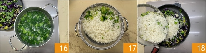 Continue cozinhando 16 e escorra quando o arroz estiver al dente 17. Transfira o arroz com os brócolis para a frigideira com os legumes 18 e salteie tudo até que o arroz esteja totalmente cozido.