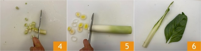 Corte o talo restante ao meio e depois em cubos 4. Limpe o alho-poró: remova o pedúnculo e a extremidade verde, depois retire a folha mais externa, em seguida corte em rodelas 5. Limpe a acelga: remova a extremidade e separe as folhas dos talos 6.