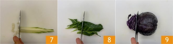Corte os talos ao meio e depois em pedaços 7. Corte também as folhas em pedaços 8. Por fim, limpe o repolho roxo: remova a extremidade e divida-o ao meio, depois corte em julienne 9.