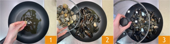 Para preparar o arroz venere com brócolis e frutos do mar, aqueça um fio de azeite na frigideira com o dente de alho 1. Adicione mexilhões e amêijoas já limpas 2, cubra com a tampa 3 e cozinhe por 3-4 minutos ou até que se abram.