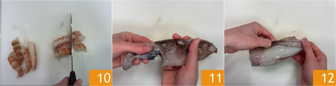 Corte a carne dos camarões em pedaços 10. Limpe as lulas: separe a cabeça e a cartilagem interna 11, em seguida, remova a pele 12.
