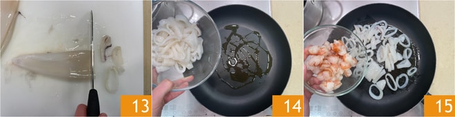 Corte o corpo em rodelas 13. Aqueça um fio de azeite na frigideira e adicione os anéis de lula 14 e os camarões 15.