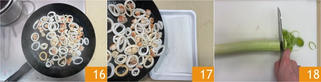 Sauté os anéis de lula em fogo alto por 3 minutos 16, depois escorra tudo em um papel toalha 17. Limpe o alho-poró e corte-o em rodelas 18.