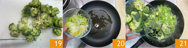 Separe os floretes do brócolis e divida-os ao meio 19. Agora na mesma frigideira, aqueça um fio de azeite, adicione o alho-poró fatiado 20 e refogue rapidamente, depois acrescente os brócolis 21.