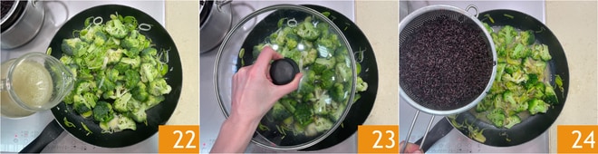 Regue com o líquido dos moluscos 22, cubra com a tampa 23 e cozinhe por 5 minutos. Retire a tampa e adicione o arroz venere escorrido 24.