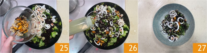 Complete com as lulas, os camarões salteados, os mexilhões 25, as amêijoas, um fio de azeite cru 26 e leve imediatamente à mesa o arroz venere com brócolis e frutos do mar 27!