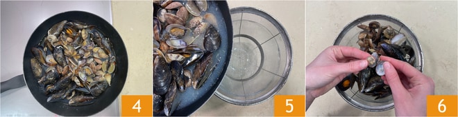 Uma vez prontos 4, coe-os através de um peneira 5 e reserve o líquido de cozimento. Separe os moluscos das conchas 6.